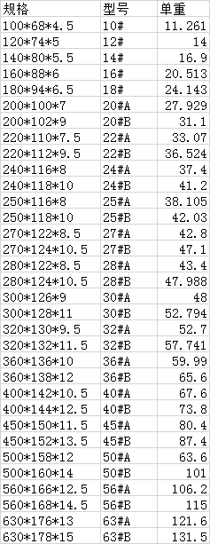 规格型号单重分别为:100*68*4.5,10#,11.261;120*74*5,12#,14;140*80*5.5,14#,16.9;160*88*6,16#,20.513。